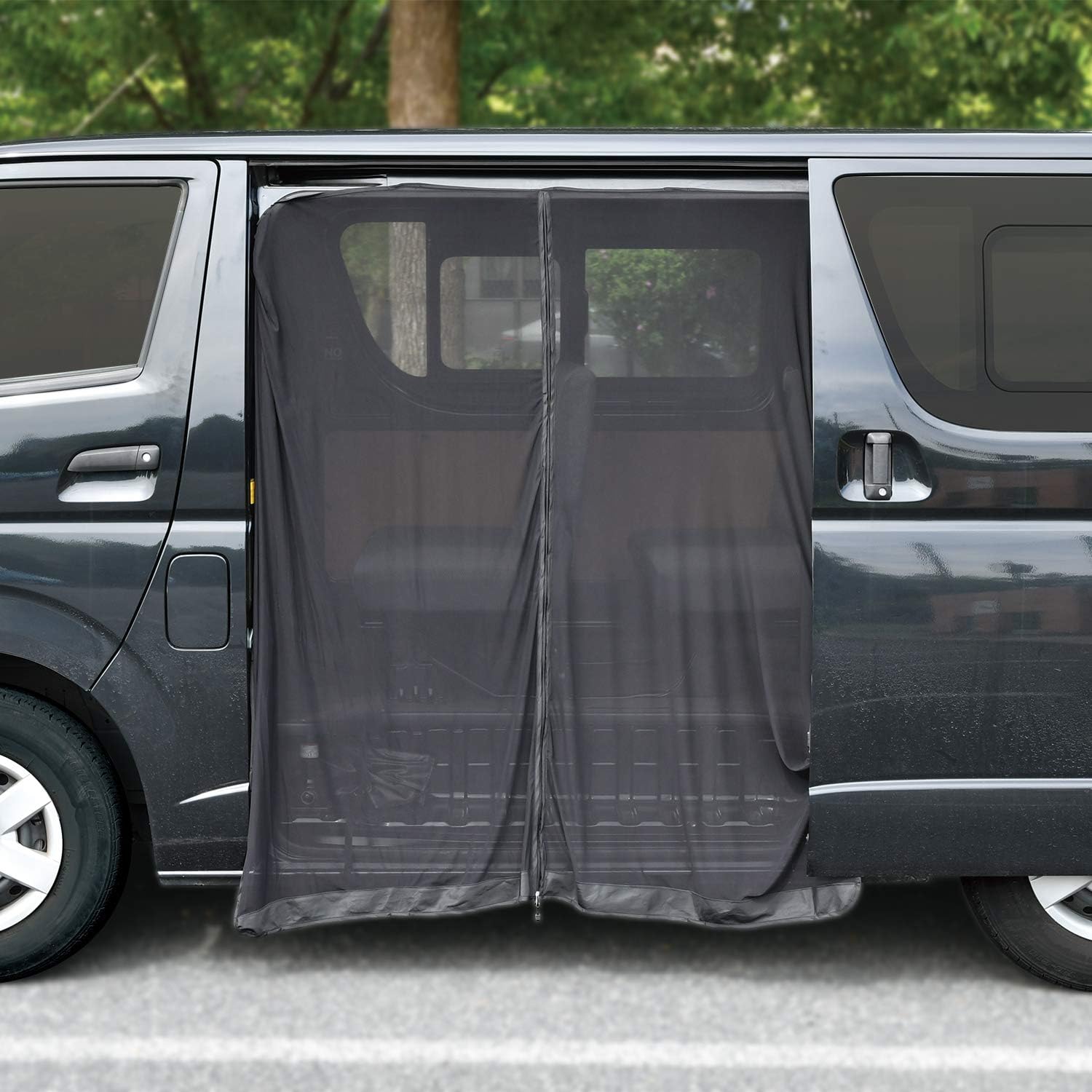 うちのハイエースでは、バックドアにAmazonで購入した5,900円の網戸(下にリンクと動画)ありと、パワースライドドアに有名なユーアイビークルの商品13,800円を使っています。